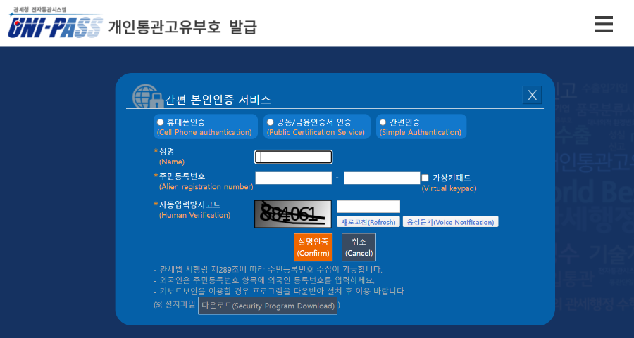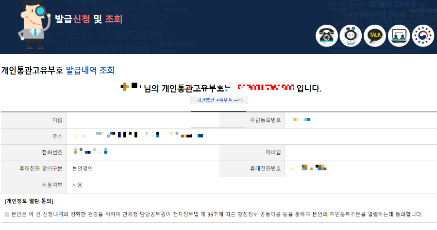 개인통관고유부호 조회를 위해서도 본인 인증이 필요하기 때문에