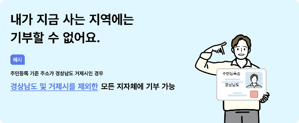 기부 대상: 개인이 자신의 현재 주민등록상 주소지 외의 모든 지방자치단체(시·도, 시·군·구)에 기부할 수 있습니다. (자신의 주소지에는 기부할 수 없습니다.)