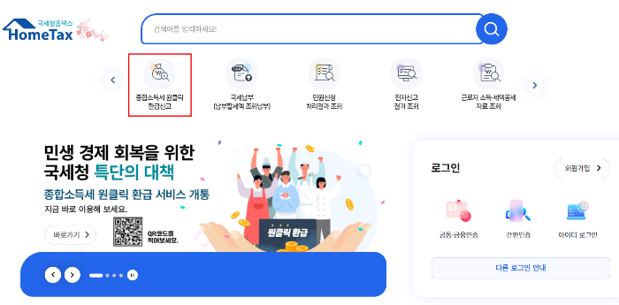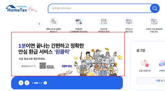 국세청 홈택스 홈페이지에 접속해 종합소득세 원클릭 환급 신고를 클릭한 뒤 로그인해주세요.