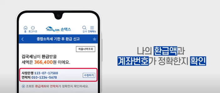 나의 환급액과 계좌번호가 정확한지 확인합니다.