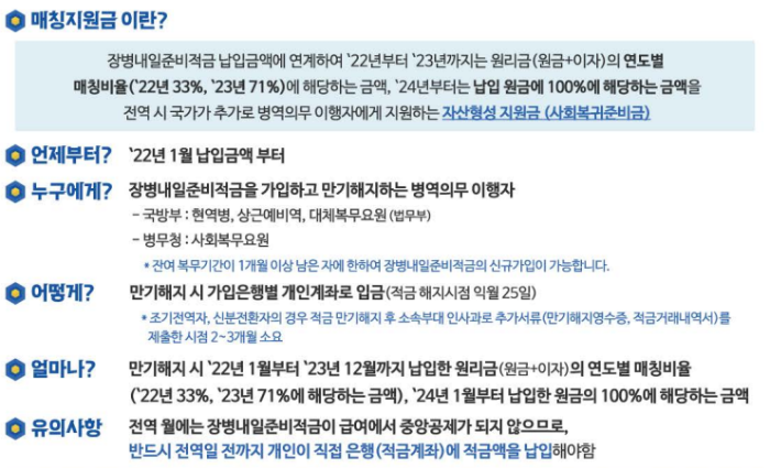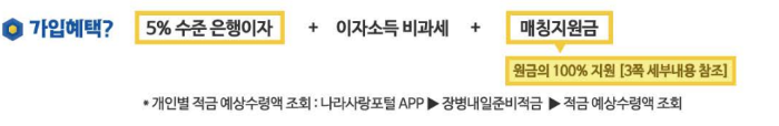 → 은행 이자 + 정부 매칭 지원금으로 전역 시 목돈 마련 가능