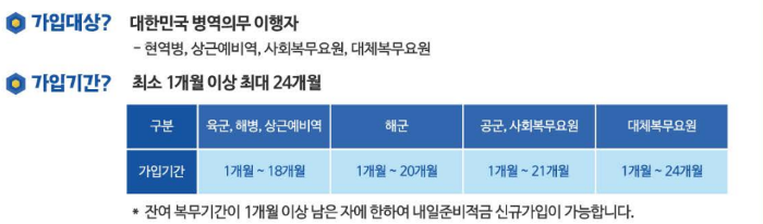 장병내일준비적금은 복무 형태에 따라 가입 가능한 최대 기간이 다릅니다.