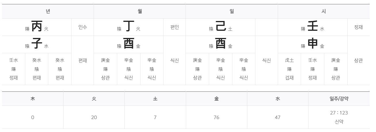 생년월일 등 정보를 넣고, 운세보기를 클릭하면 우선 본인의 사주를 확인할 수 있습니다.