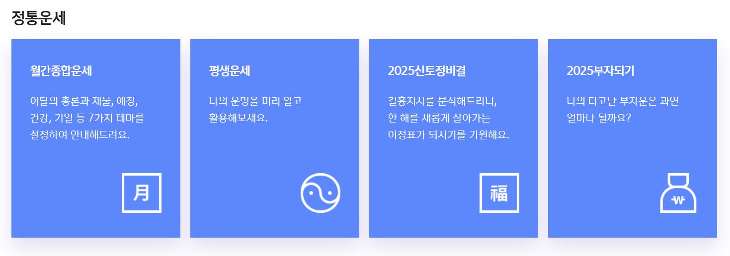 - 주간 종합운세: 한 주간의 흐름을 파악할 수 있는 종합 운세 서비스입니다.