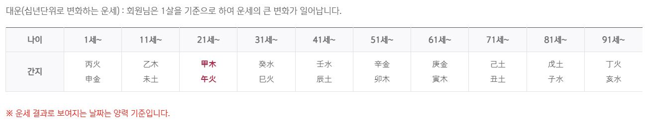 그리고 10년 단위로 바뀐다는 대운도 확인할 수 있어요.