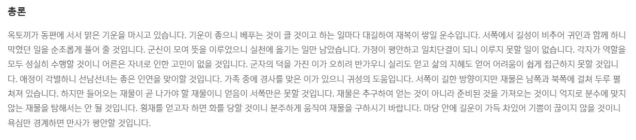 - 월간 종합운세: 한 달 동안의 총운, 재물, 애정, 건강, 길일 등 7가지 테마를 확인할 수 있습니다.
