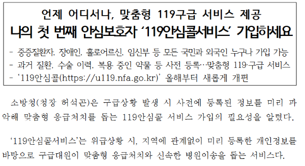 이를 위해 소방청에서는 119 안심콜 서비스를 운영하고 있습니다. 이 서비스는 사전에 등록한 의료 정보와 보호자 연락처를 활용해 맞춤형 응급처치를 지원하는 시스템입니다.