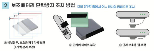 ✅ 절연 보호 필요: 단락 방지를 위해 보조배터리는 보호형 파우치, 지퍼백 또는 비닐봉투 등에 보관해야 하며, 단자가 금속과 접촉하지 않도록 절연테이프로 커버해야 합니다.