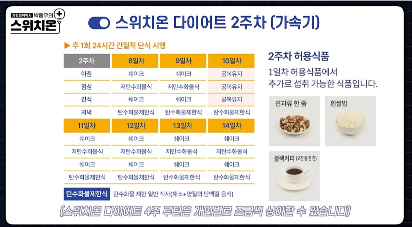 그리고 2주차부터는 주 1회 24시간 단식을 실시하는데요. 자정부터 24시간 굶는 것이 아니라 이른 저녁식사 후 익일 오후 간식까지 단식 후 저녁식사를 정상적으로 드시면 됩니다. 단식 후에는 무탄수 식사를 배부르게 먹어줍니다.