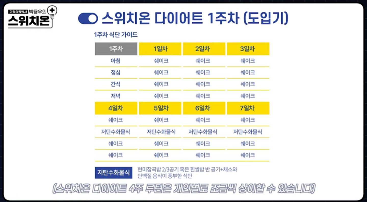 요즘 SNS에서 핫한 스위치온 다이어트는 강북삼성병원 가정의학과 전문의 박용우 박사가 33년 비만치료를 해오면서 정리한 다이어트 프로그램으로, 4주간의 실천을 통해 대사이상체중을 정상체중으로 되돌리는 것을 목표로 하는 다이어트 방법입니다.