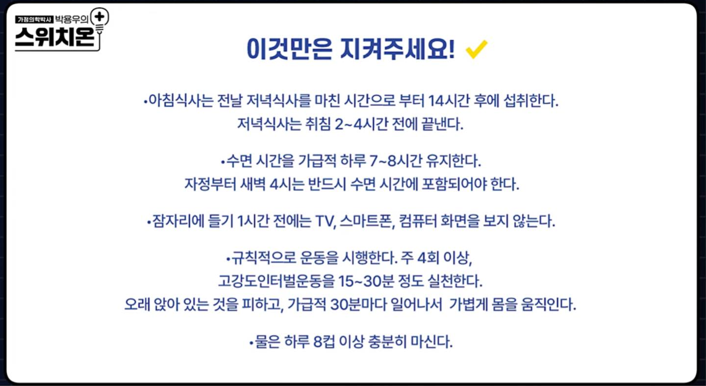 요즘 SNS에서 핫한 스위치온 다이어트는 강북삼성병원 가정의학과 전문의 박용우 박사가 33년 비만치료를 해오면서 정리한 다이어트 프로그램으로, 4주간의 실천을 통해 대사이상체중을 정상체중으로 되돌리는 것을 목표로 하는 다이어트 방법입니다.