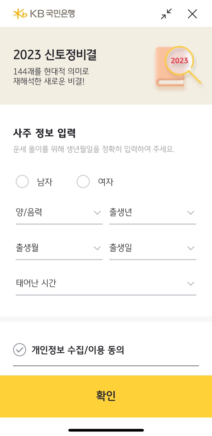 2023년 토정비결을 확인하기 위해 생년월일과 태어난 시간 등 사주 정보를 입력하고 확인버튼을 클릭하면 2023년 토정비결을 바로 확인할 수 있습니다.