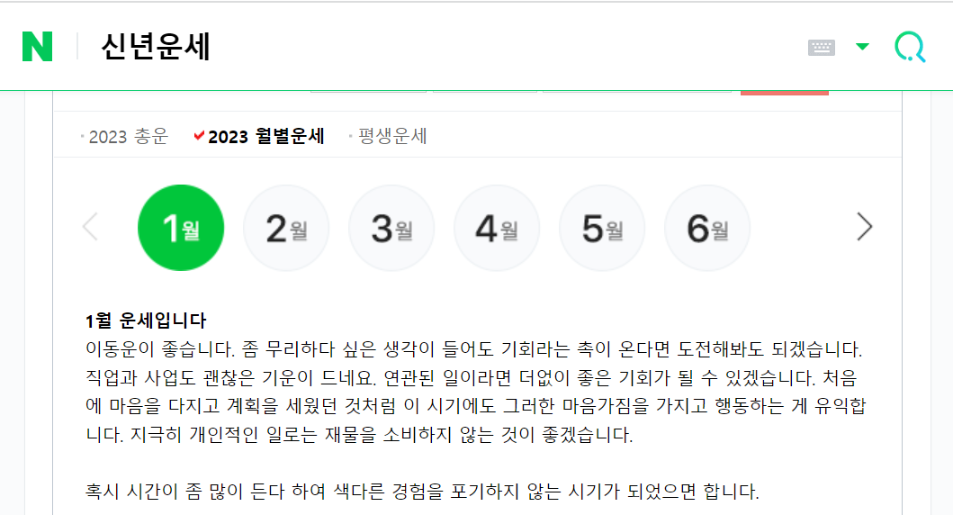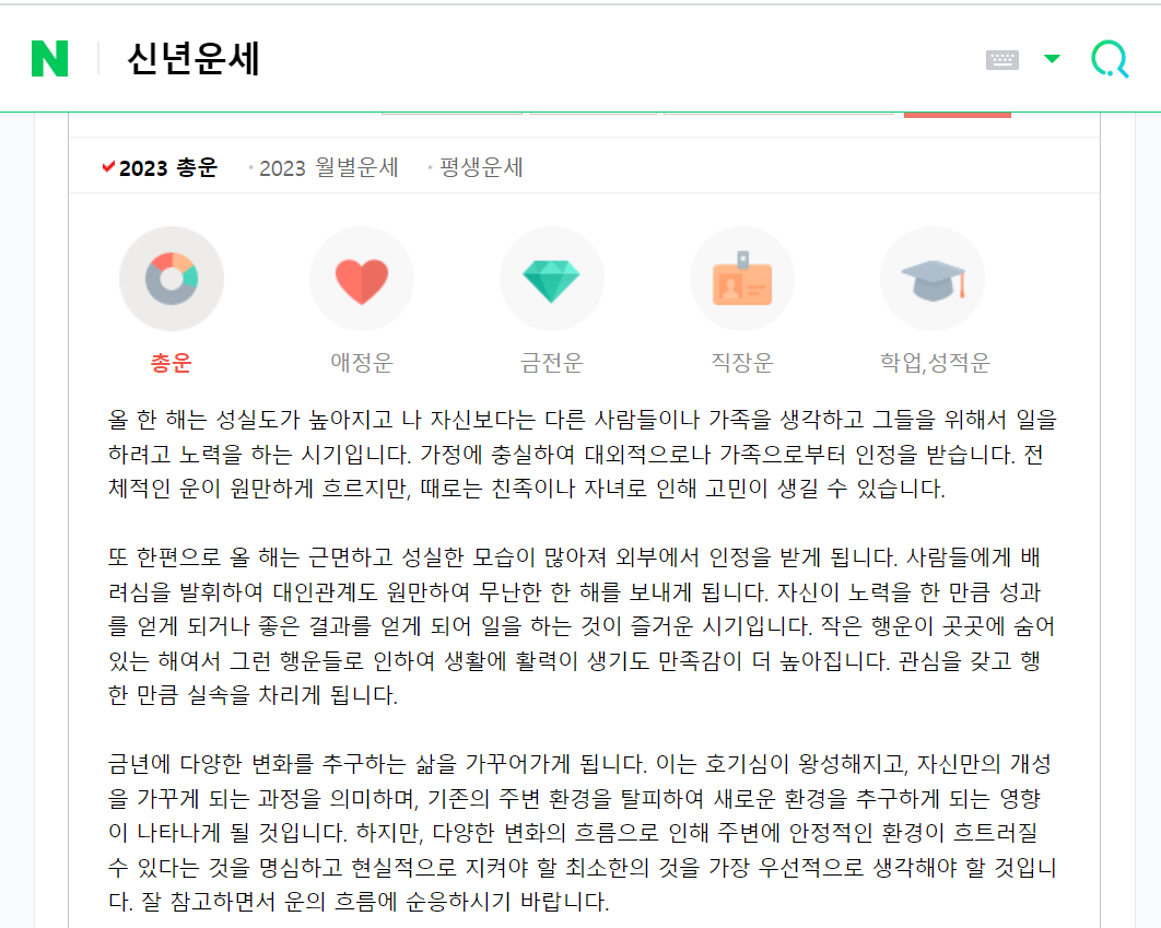 네이버에서는 2023년 총운과 애정운, 금전운, 직장운, 학업,성적운을 확인할 수 있습니다. 또한 2023년 신년운세뿐만 아니라 2023년 월별운세와 평생운세까지 한 번에 확인이 가능하답니다.