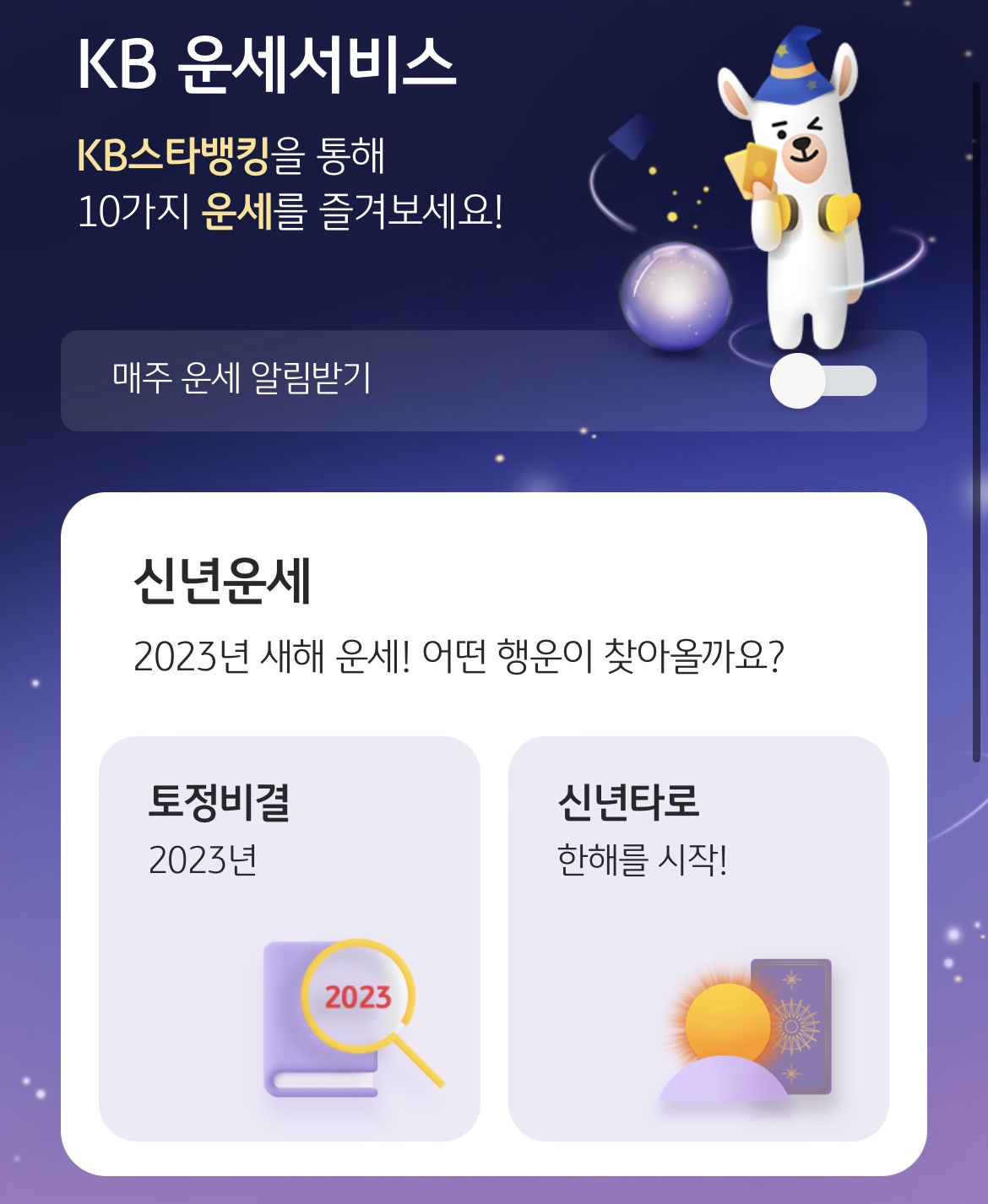 어렵지 않게 2023년 신년운세를 무료로 확인할 수 있으니 KB스타뱅킹을 사용하시는 분들이라면 한번쯤 이용해보시는걸 추천드립니다