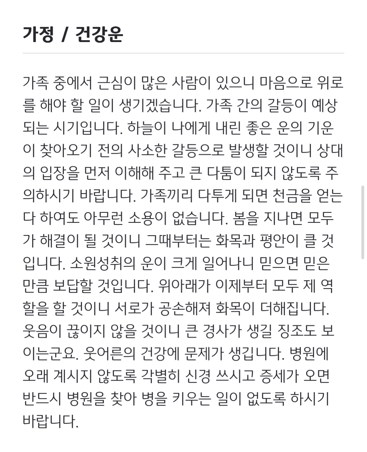 2023년 총론부터 재물운, 직장운, 사업운, 가정운, 건강운, 이성운, 대인관계운까지 생각보다 자세하게 확인할 수 있어서 깜짝 놀랐답니다. 그리고 사진에는 없지만 1월부터 12월까지 월별운도 확인할 수 있었어요