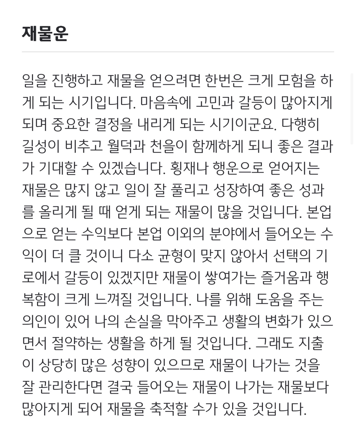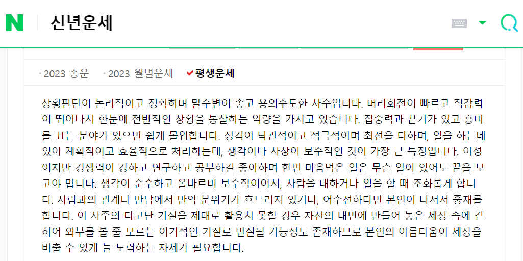 2023년 월별 운세도 생각보다 자세하게 나와있고, 평생운세도 짧지만 잘 나와있는걸 확인할 수 있었습니다. 사실 평생운세를 보면서 너무 제 이야기라서 깜짝 놀랐답니다.