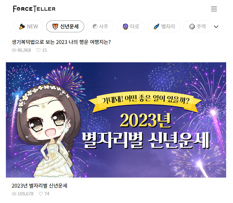 포스텔러에서는 사주뿐만 아니라 별자리, 타로 등 다양한 방법으로 신년운세를 확인할 수 있습니다. 그리고 2023년 상반기 행운의 달이나 2023년 행운 여행지 등 다양한 종류의 운세를 무료로 확인할 수 있다는 장점도 가지고 있습니다.