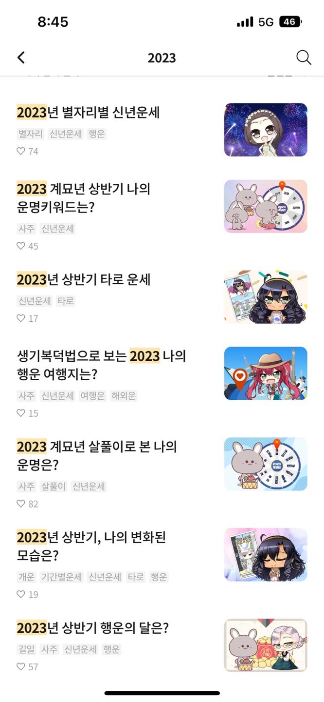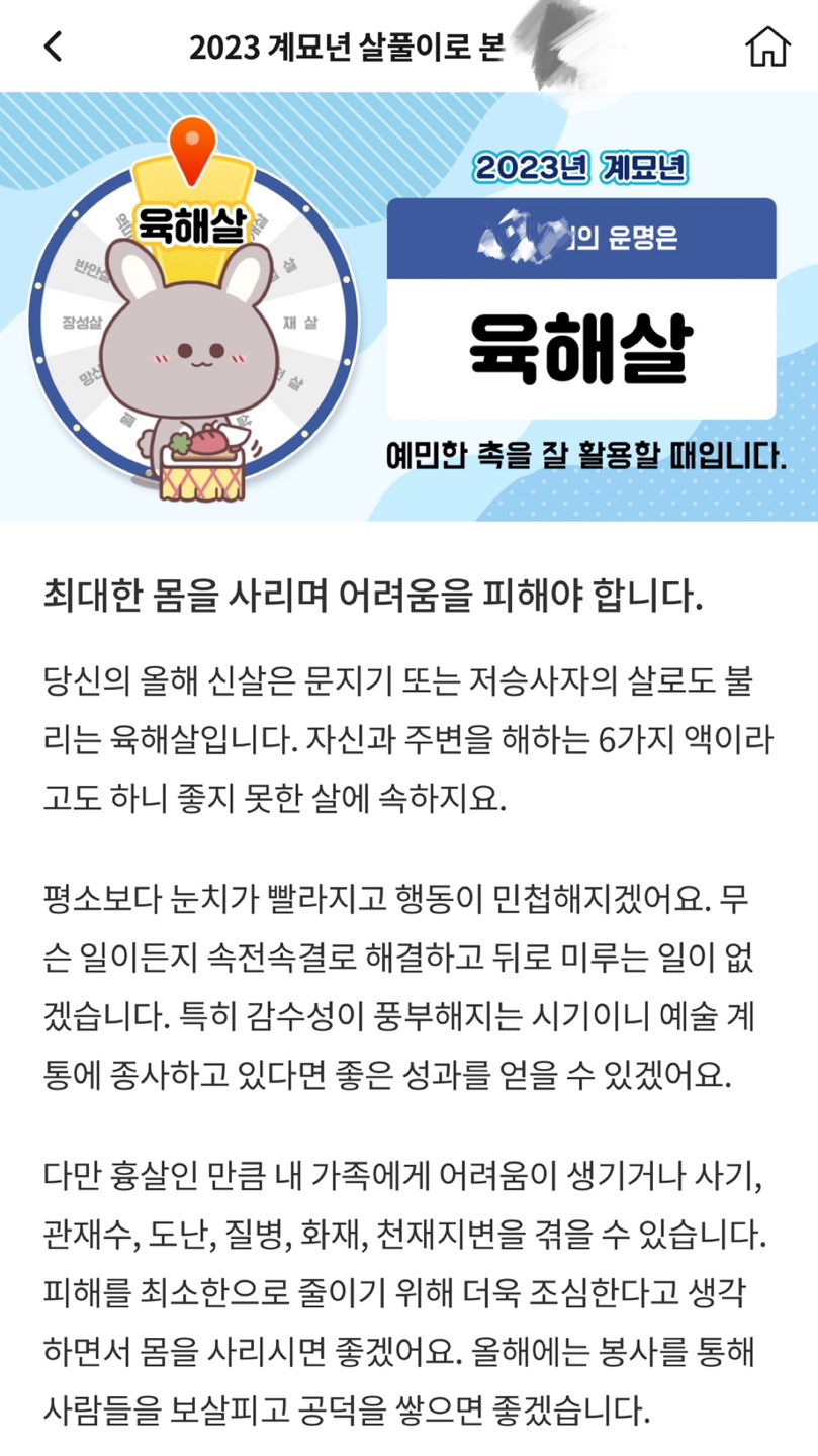 저도 포스텔러를 통해 2023년 신년운세를 무료로 알아보았는데요. 상반기 행운의 달은 6월로 나오고, 2023년에는 육해살이 껴있는 한 해가 된다고 하네요. 부디 아무 사건 사고 없이 지나가는 한해가 되길..