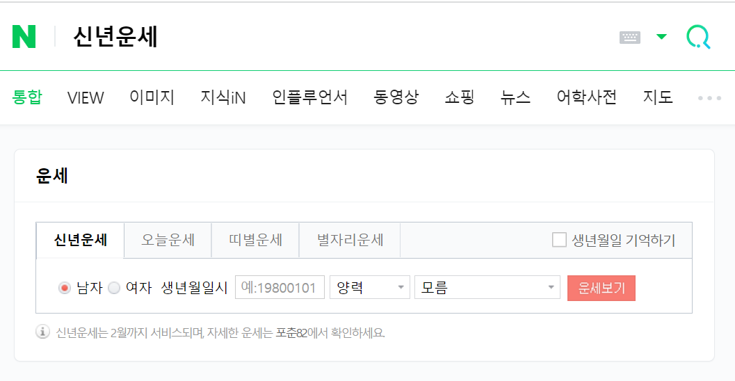 네이버에 신년운세를 검색한 뒤, 생년월일과 태어난 시간을 입력하면 간단하게 신년 운세를 확인할 수 있습니다.