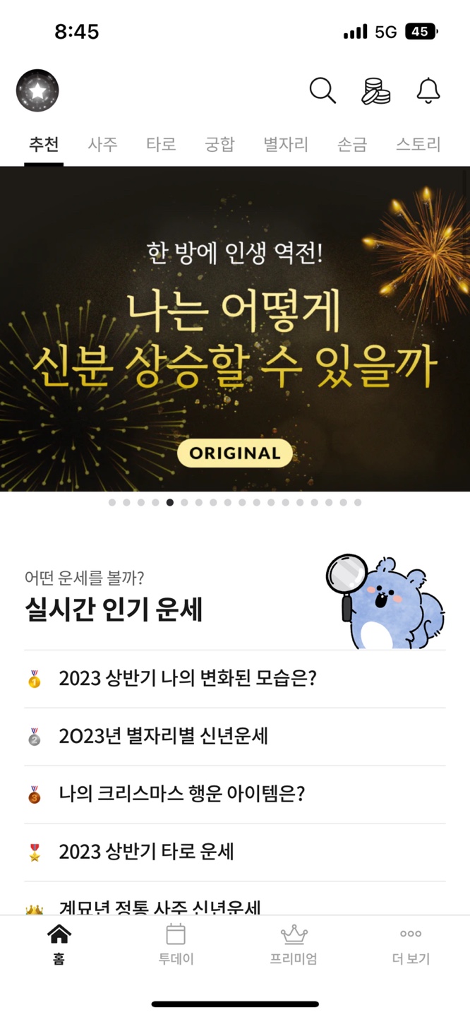 어플에 들어가셔서 밑으로 내리면 2023년 신년운세 메뉴를 확인하실 수 있는데요. 신년운세 버튼을 누르시면 2023년 토정비결과 신년타로를 볼 수 있는 창이 나온답니다. 그리고 신년운세뿐만 아니라 오늘의 운세 등 다양한 종류의 운세도 확인해보실 수 있으세요