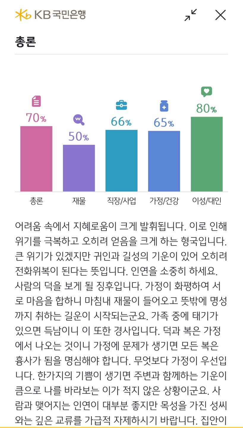 두번째로 추천드리는 무료로 신년운세를 볼 수 있는 곳은 KB스타뱅킹 어플입니다. PC로는 안되시고, KB스타뱅킹 어플로만 가능해서 국민은행 어플을 사용하시는 분들에게 추천드리는 방법입니다.