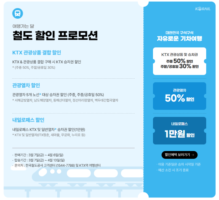 ✅ KTX 및 주요 관광열차 이용 시 최대 30% 할인 제공
