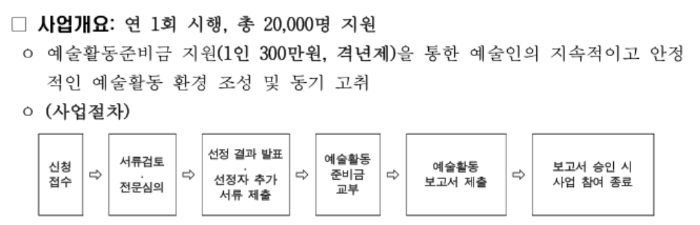 예술활동준비금 지원사업은 예술인들이 경제적 이유로 창작을 중단하지 않도록 지원하는 사업으로, 격년 지원 형태로 운영됩니다.