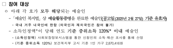 본 사업은 경제적으로 어려운 예술인을 대상으로 하기 때문에, 소득 기준을 초과하거나 기타 제한 요건에 해당하는 경우 지원 대상에서 제외됩니다. 신청 전에 본인의 신청 자격을 반드시 확인하는 것이 중요합니다.