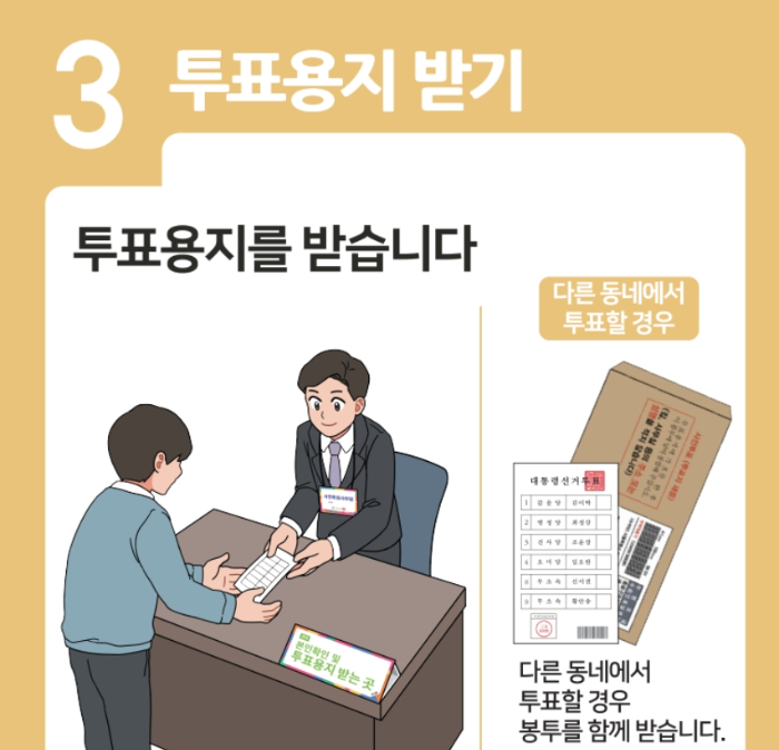 사전투표는 본투표와 유사하지만, 몇 가지 다른 절차가 있습니다. 아래 순서대로 따라오시면 됩니다.