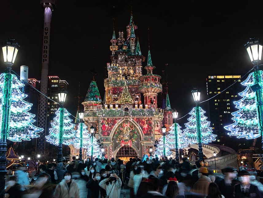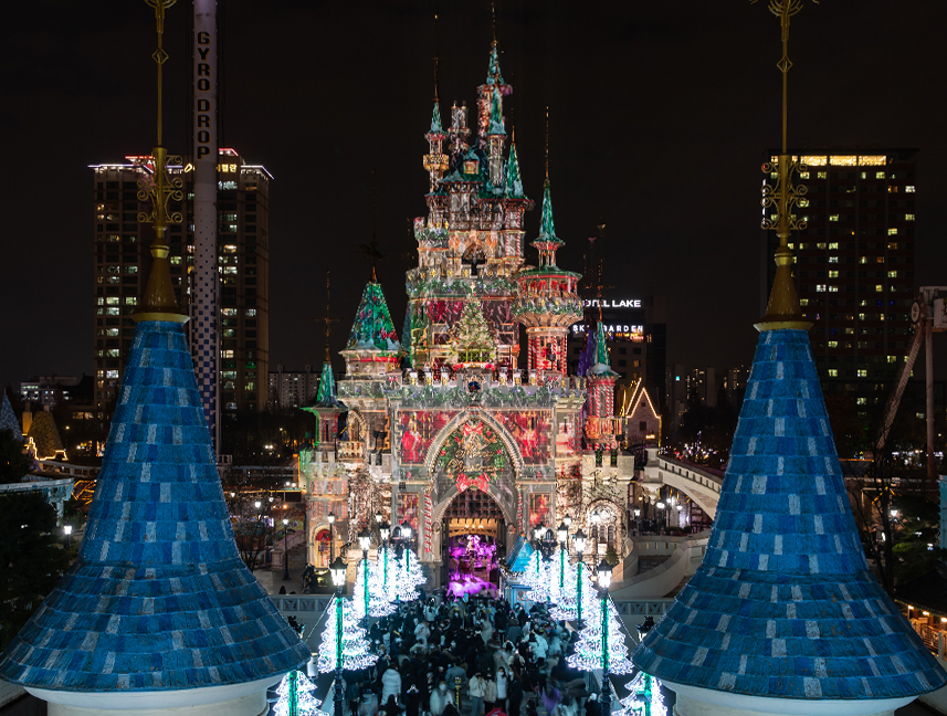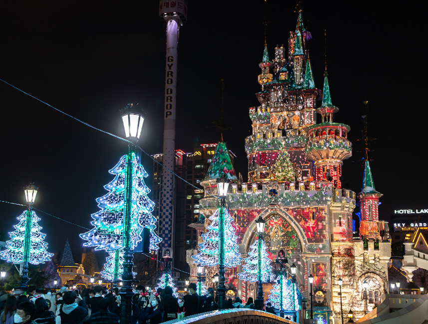 크리스마스 분위기로 꾸며진 화려한 롯데월드 캐슬 앞에서 찍는 사진이라면 어떤 사진이든 인생샷이 될 것 같은 느낌이 들어요! 예쁜 사진과 즐거운 놀이기구로 롯데월드에서 크리스마스 데이트하는 것도 좋을 것 같아요