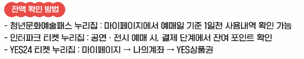 ✅ 청년문화예술패스 누리집 마이페이지에서 예매일 기준 1일전 사용내역을 확인할 수 있습니다.