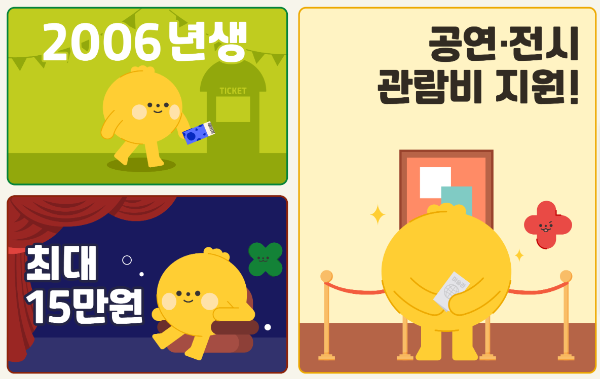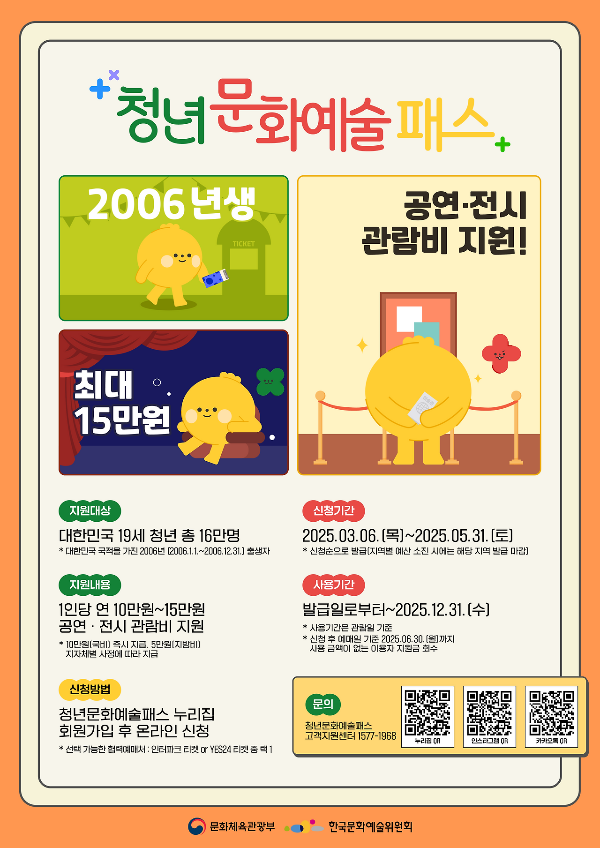 2006년생 청년이라면 이번 기회를 놓치지 말고 ‘청년 문화예술패스’를 신청해 보세요! 15만 원의 지원금으로 다양한 문화예술 활동을 경험하며 더욱 풍부한 문화 생활을 즐길 수 있습니다. 보다 자세한 사항은 한국문화예술위원회 공식 홈페이지를 통해 확인하시기 바랍니다.