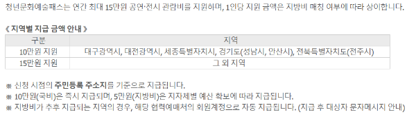 대구광역시, 대전광역시, 세종특별자치시, 경기도 성남시, 경기도 안산시, 전북 전주시는 10만원이 지원되며, 그 외 지역은 15만원이 지원됩니다.