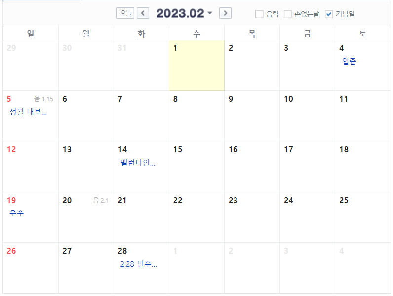아쉽게도 2023년 2월에는 공휴일이 없네요