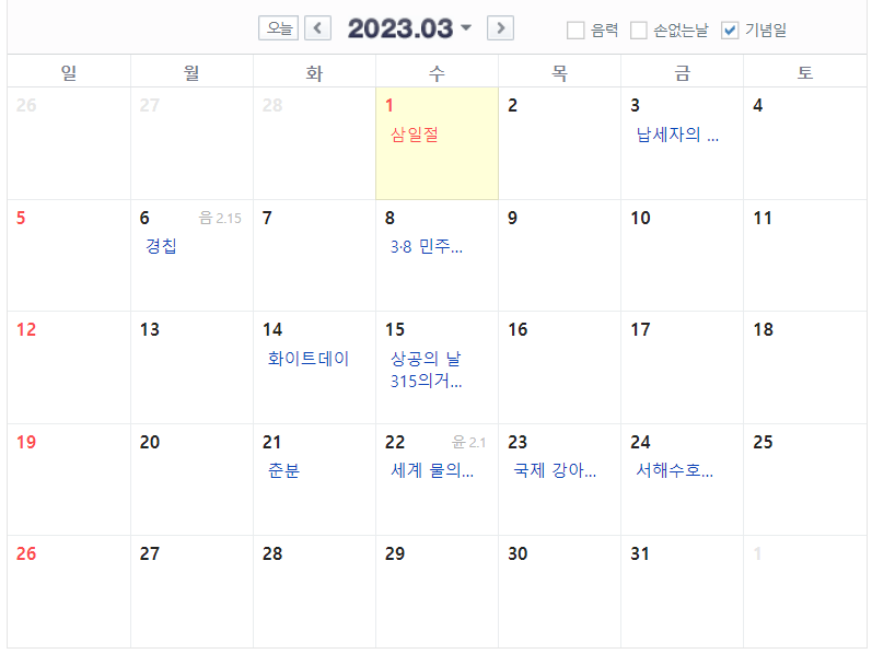2023년 3월 공휴일에는 1일(삼일절)이 있습니다.