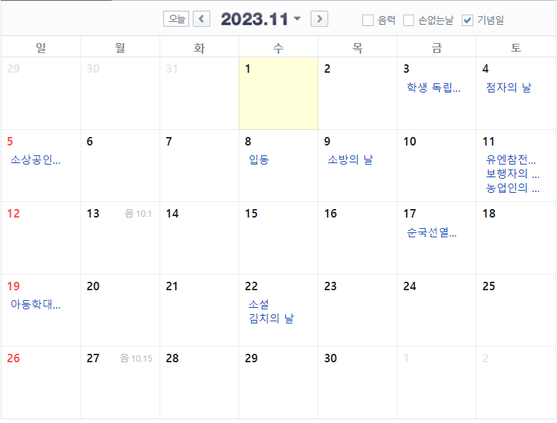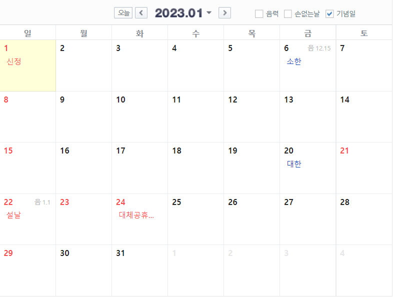 | 1 | 2023년 1월 1일 일요일 | 신정 |
