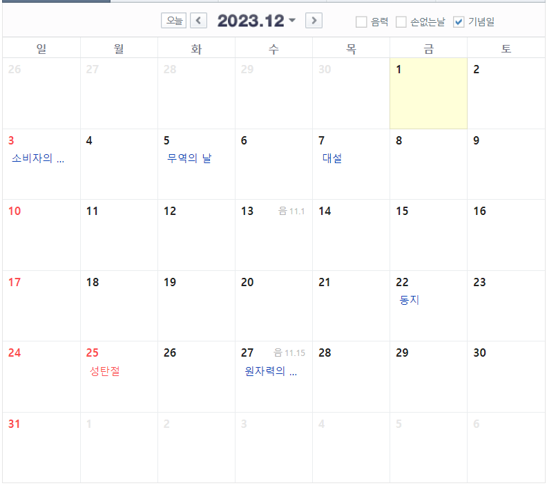 2023년 12월 공휴일에는 크리스마스(25일)가 있습니다