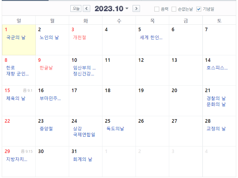 2023년 10월 공휴일은 개천절(1일)과 한글날(9일)이 있습니다