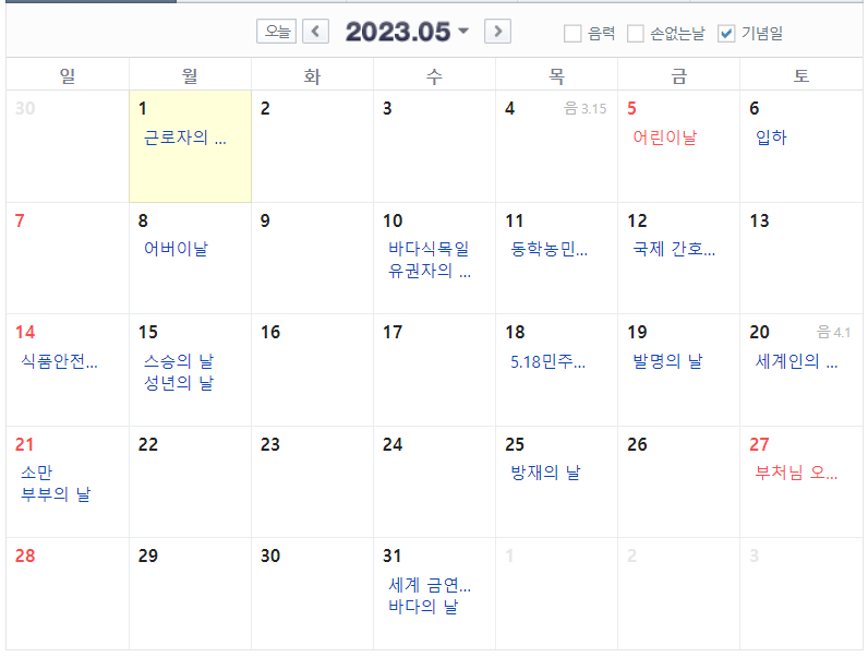 | 8 | 2023년 5월 27일 토요일 | 석가탄신일(부처님 오신 날) |