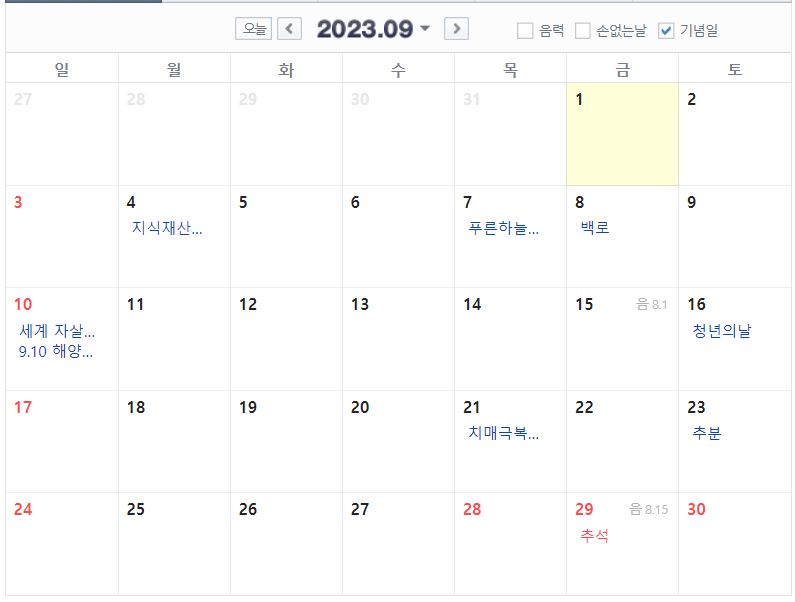 2023년 9월 공휴일은 추석(9월 28일~30일)이 있습니다