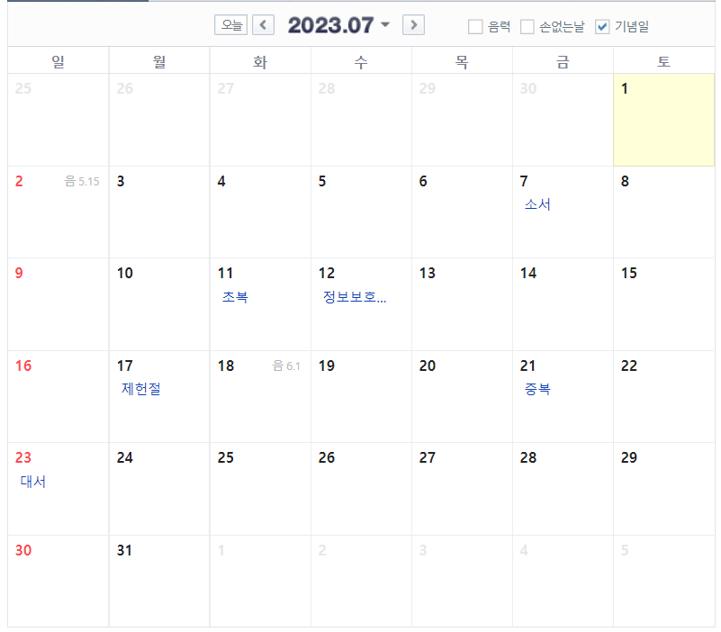 2023년 7월에는 쉴 수 있는 공휴일은 없지만 17일에 제헌절이 있어요