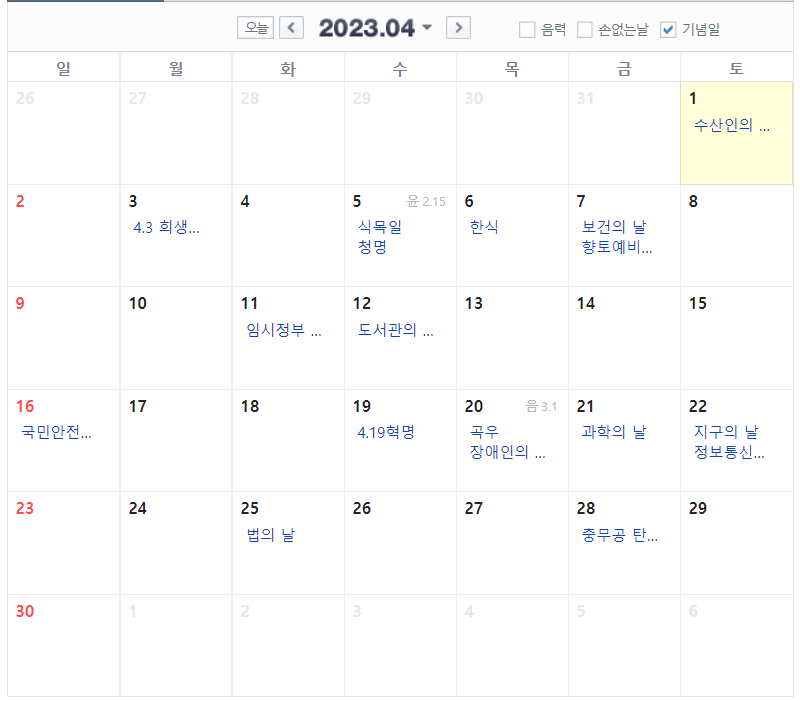2023년 4월에도 2월과 동일하게 공휴일이 없습니다