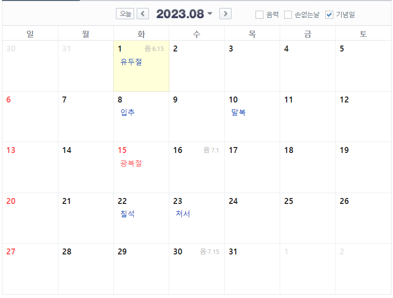 2023년 8월 공휴일은 15일(광복절)이 있습니다.