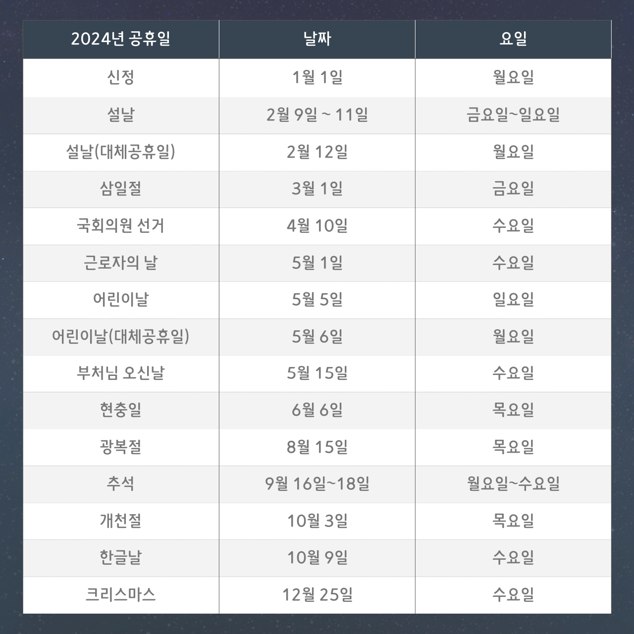 새해계획 혹은 휴가계획을 짜고계신다면 2024년 쉬는 날을 잘 확인하신 뒤