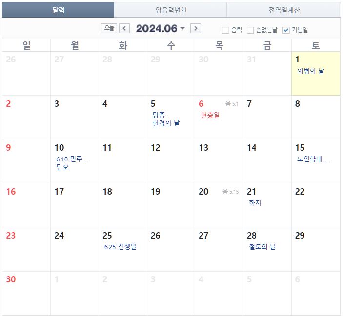 6월에는 6월 6일 목요일 현충일이 있습니다