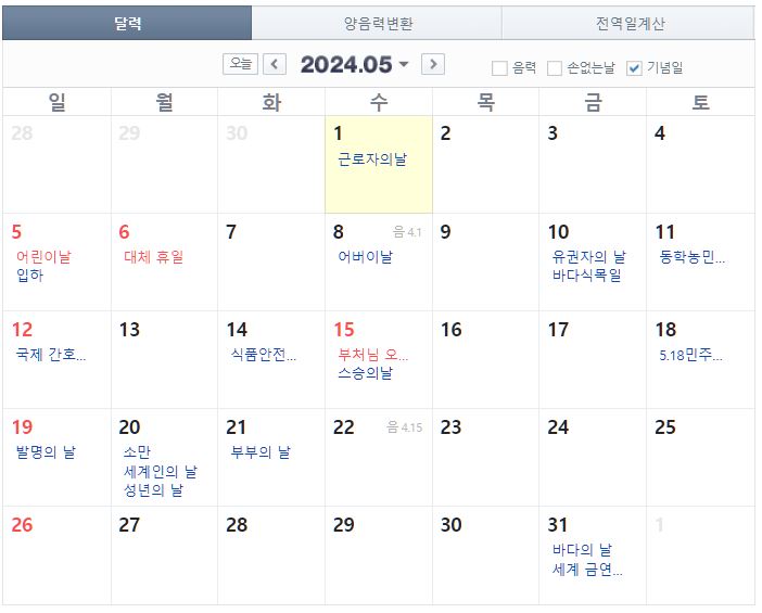 또한 5월 1일도 근로자의 날로 빨간 날은 아니지만 많은 근로자분들이 휴식을 취하는 날이죠
