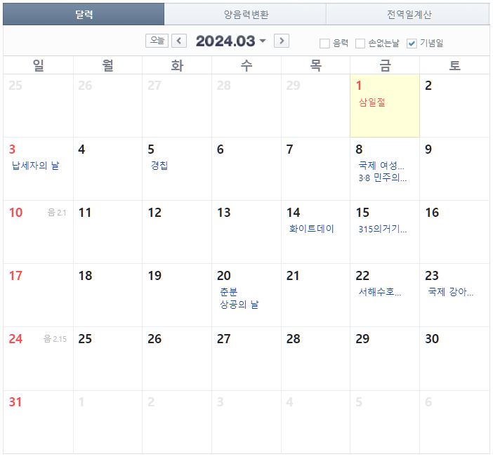 3월의 유일한 휴일은 3월 1일 삼일절입니다
