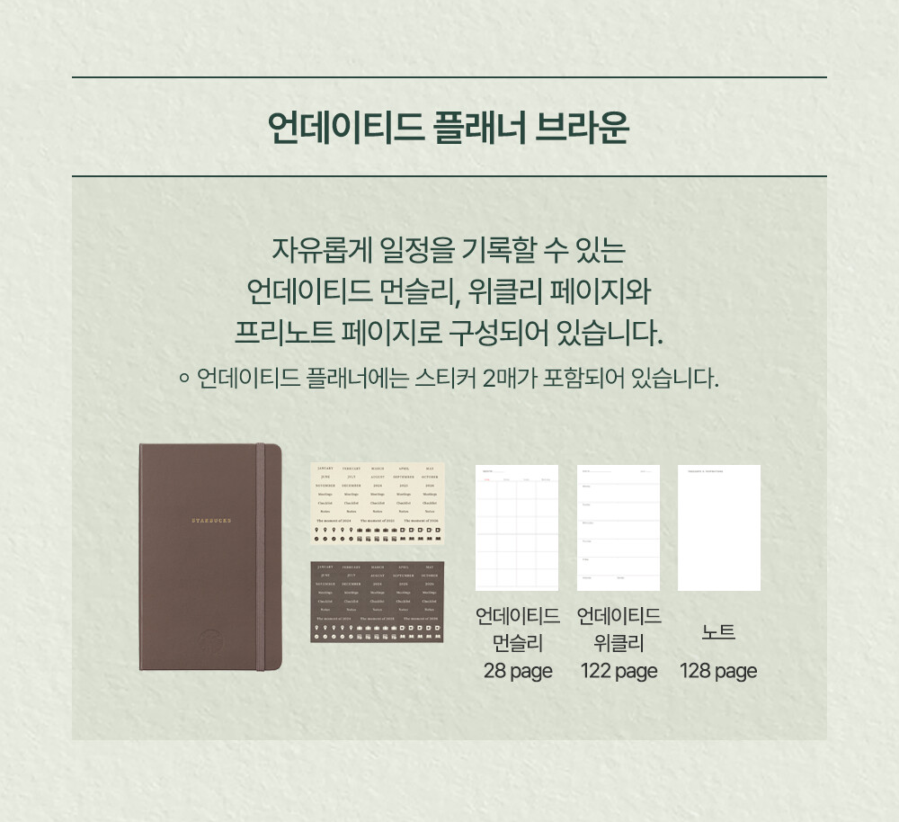 언데이티드 플래너는 먼슬리, 위클리 페이지와 프리노트 페이지로 구성되어 있고,