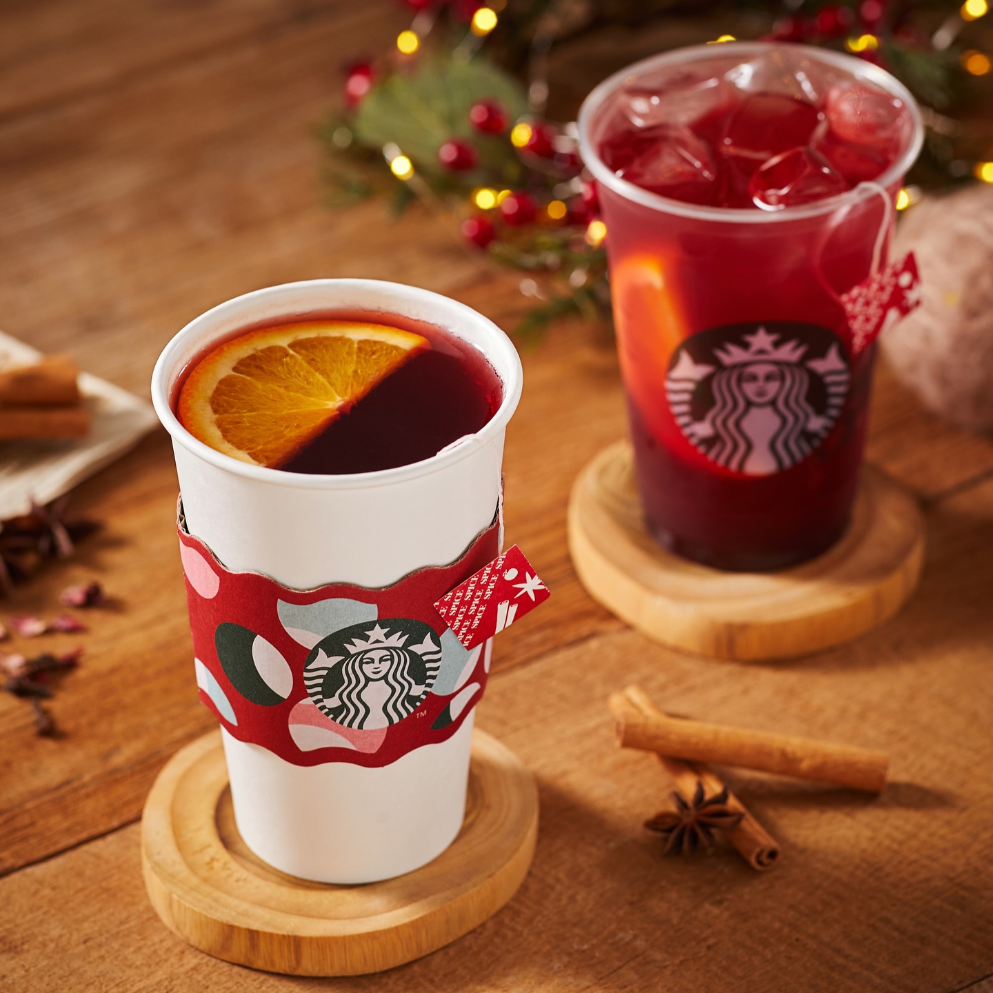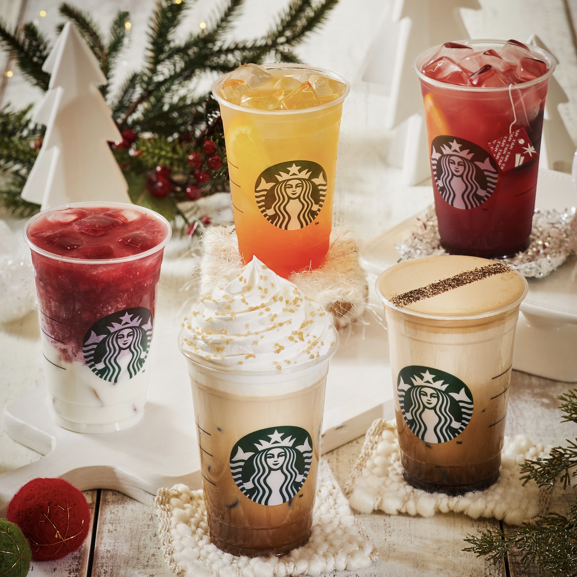 크리스마스 음료(토피 넛 라떼, 더블 에스프레소 그림 라떼, 논알코올 홀리데이 패션 티 뱅쇼, 스타벅스 딸기 라떼, 골든 캐모마일 릴렉서), 리저브 카페고리 음료