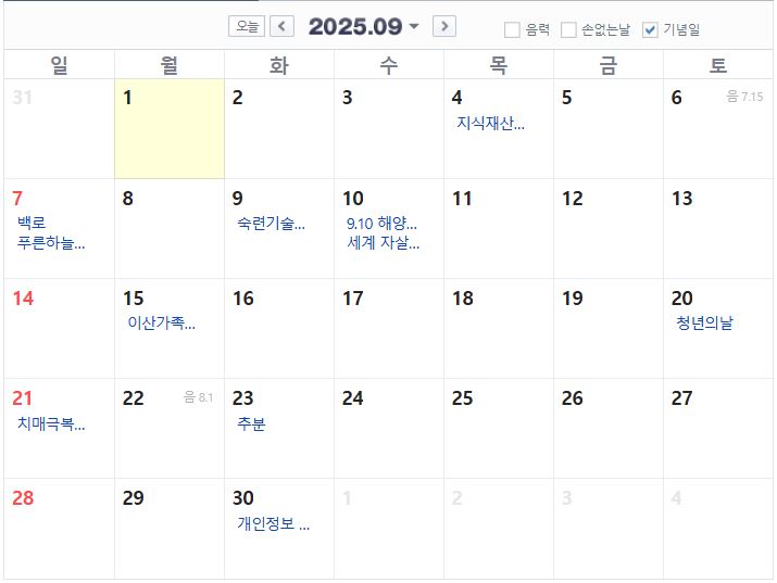 9월에도 공휴일이 없어요..ㅠ 그래도 9월에는 종종 추석이 있기도 한데, 2025년 9월은 공휴일이 하루도 없네요..9월은 날씨도 좋은데 공휴일까지 있으면 참 좋을 것 같아요